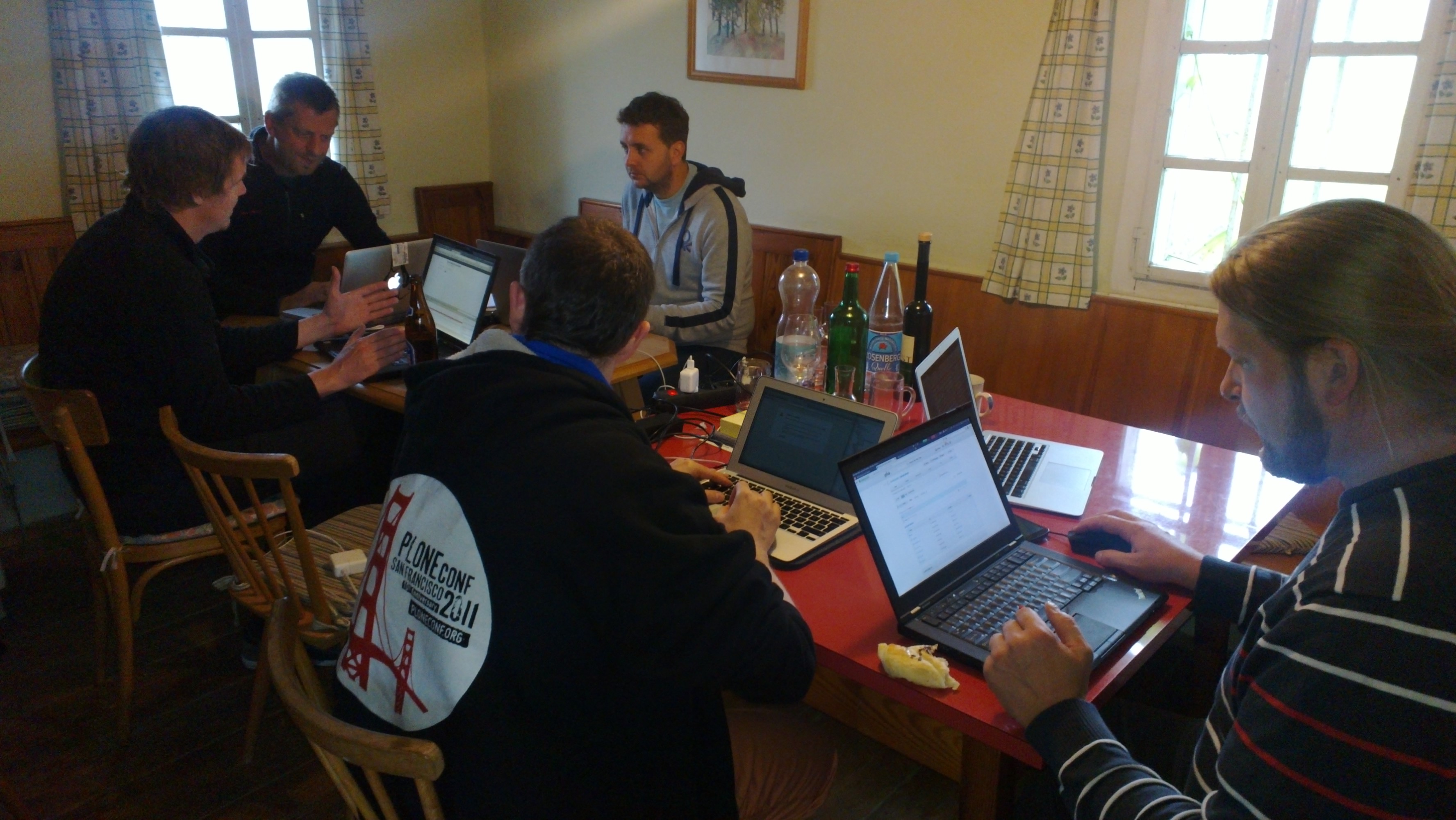 The Buschenschanksprint began with an introduction to the new g24.at (not online now), a complete rewrite of a social community site for Graz based on Plone. One of the key technologies of the new g24.at are dynamic dexterity behaviors per content object, event integration based on plone.app.event, a simple but powerful rich text editor based on WYSIHTML5 with embed.ly direct integration and forms based on YAFOWIL. YAFOWIL itself - BlueDynamics's Yet Another FOrm WIdget Library - was then this year's biggest focus at the Buschenschanksprint. We integrated Twitter's Bootstrap library, created a YAFOWIL demo project (online in some time soon), and integrated many new widgets. We have now XING's great WYSIHTML5 editor and the the Aloha editor integrated as well as some nice jQuery based multiselect and autosuggest widgets. More still to come, like the great jQuery File Upload widget! Robert and Dorian created a YAFOWIL integration layer for Flask respectively Werkzeug and Jens created a nice Logo. Gogo finished his GoPantsPockets package, a search integration which gets it's results from different sources via XML-RPC. He uses it to collect search results from different Plone instances (which are Plone 4 as well as Plone 3 and Plone 2.5 instances). Roland was taking up some work on plone.app.event, which might become a important part of one of his upcoming projects. Ibi, who joined at the weekend was working on Kotti snippets for the Kotti CMS. Kotti snippets are comparable to Shortcodes in Wordpress or macros in MoinMoin. Little code blocks wich are replaced by some templates when rendered - for example [gallery] would be replaced with a photo gallery. Michael Haubenwallner, who runs the kulturserver-graz.at - a Zope based cultural event calendar - came for a short visit and discussion on Tuesday. Florian Apolloner from the Python User Group in Graz and part of the Ubuntuusers.de development team joined us on Wednesday during the day.